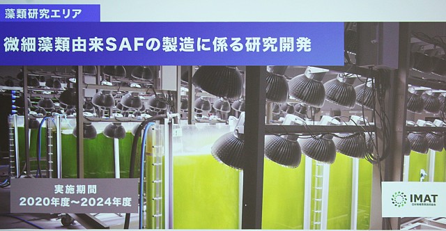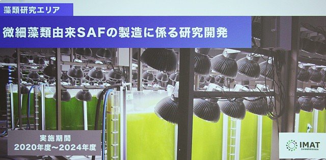 SAFは(「Sustainable Aviation Fuel(持続可能な航空燃料)」の略称。循環型の原料で製造された航空燃料を指す)。微細藻類からのSAF製造は光合成によりCO2を大気中から吸収する仕組みの為、カーボンリサイクル技術として大きな期待が寄せられている。〈IMAT(一社)日本微細藻類技術協会〉