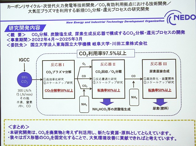 大気プラズマを利用してCO2をCOへ分解する反応器1、未反応のCO2を炭酸塩に転換する反応器2、大気プラズマを利用してCOから尿素を直接合成する反応器3の実現性の評価。