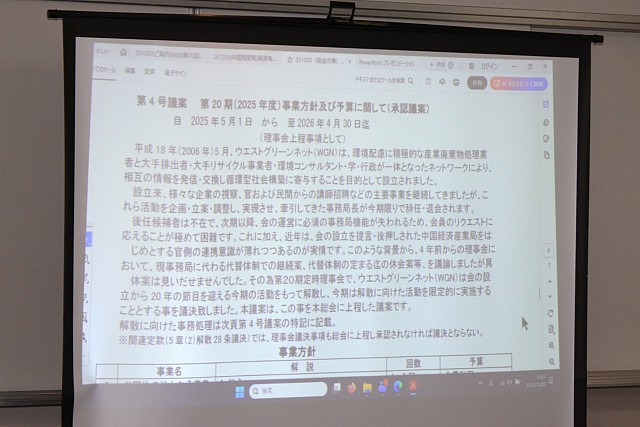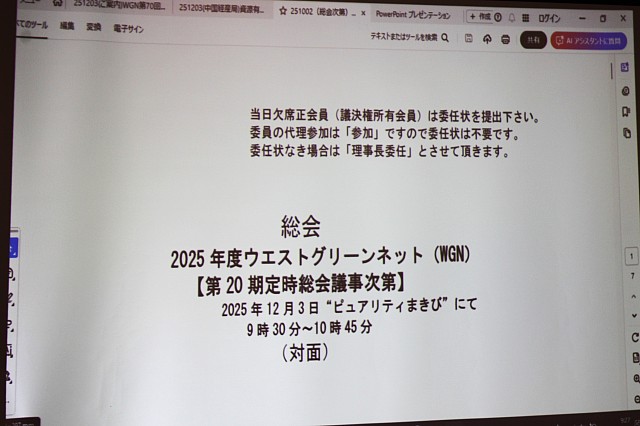 第2号議案 会員動向(入退会等)に関して(報告議案) 第3号議案 役員人事(承認議案) 第4号議案 第20期(2025年度)事業方針及び予算に関して(承認議案) ※特記:2026年度より現事務局長辞任につき、新体制での運営について 第5号議案 その他 |